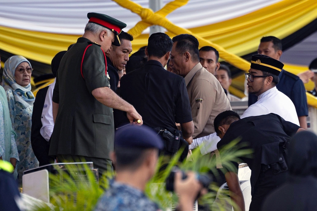 IPOH, 31 OGOS – Polis menahan seorang wanita yang cuba menyerang Sultan Perak Sultan Nazrin Shah di atas pentas utama ketika sambutan rasmi Hari Kebangsaan Peringkat Negeri Perak di sini hari ini.