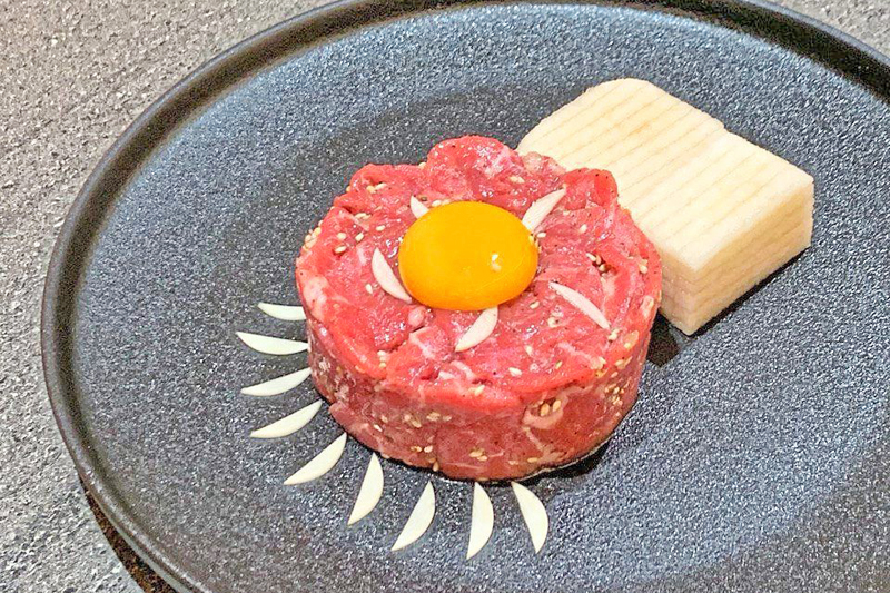 Pada asasnya tartar daging lembu Korea, daging lembu dihiris nipis, diselangi dengan hirisan lobak yang rangup dan kuning telur mentah disimpan di atasnya.