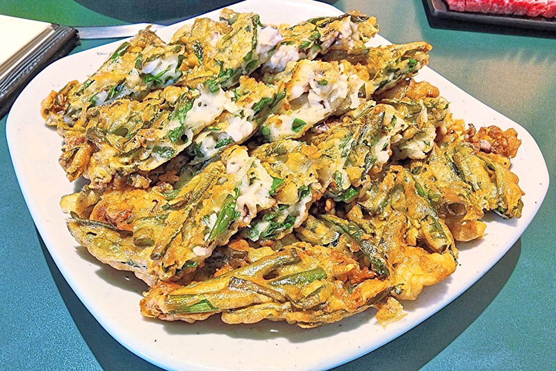 Daripada apa yang ditawarkan, awda juga perlu mencuba Pah Jeon. Penkek dimasak menggunakan kuali ala Korea itu diisi dengan daun bawang dan makanan laut.
