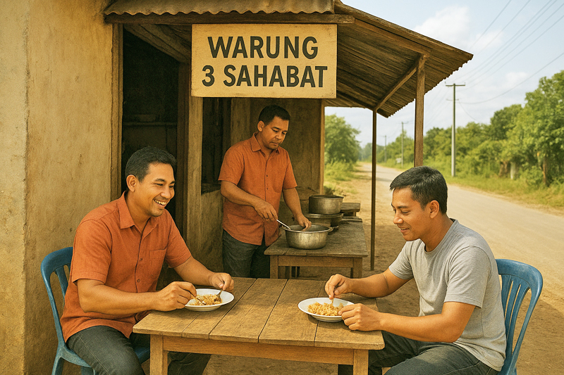 Hari pertama membuka warung, aku masih dapat rasa debaran itu. Malam sebelumnya kami bertiga hampir tidak tidur Razif sibuk menyiapkan kuah gulai ayam, Halim menyusun meja kerusi plastik biru yang baru dibeli dari kedai perabot murah, manakala aku pula menyiapkan papan tanda kayu bertulis besar, ‘Warung 3 Sahabat’, cat merah terang, supaya jelas dilihat orang lalu-lalang.