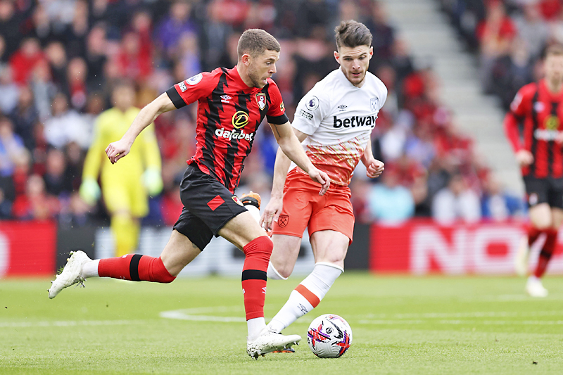 Bournemouth melancarkan serangan balas, namun West Ham menjadikan kedudukan 3-0 dua minit sebelum rehat apabila Rice merembat masuk gol untuk menjadikannya gol berturut-turut minggu ini.